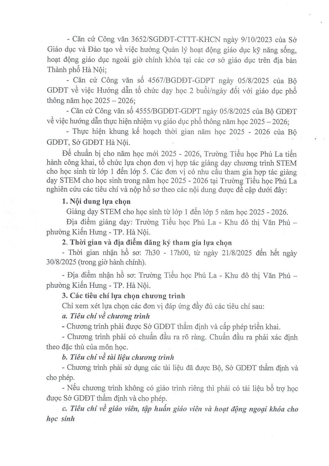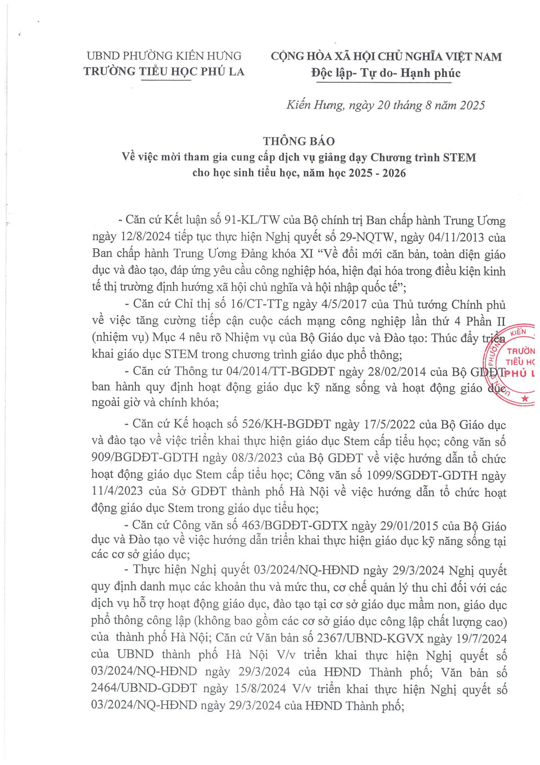 Để chuẩn bị cho năm học mới 2025 - 2026, Trường Tiểu học Phú La tiến hành công khai, tổ chức lựa chọn đơn vị họp tác giảng dạy chương trình STEM cho học sinh từ lóp 1 đến lóp 5