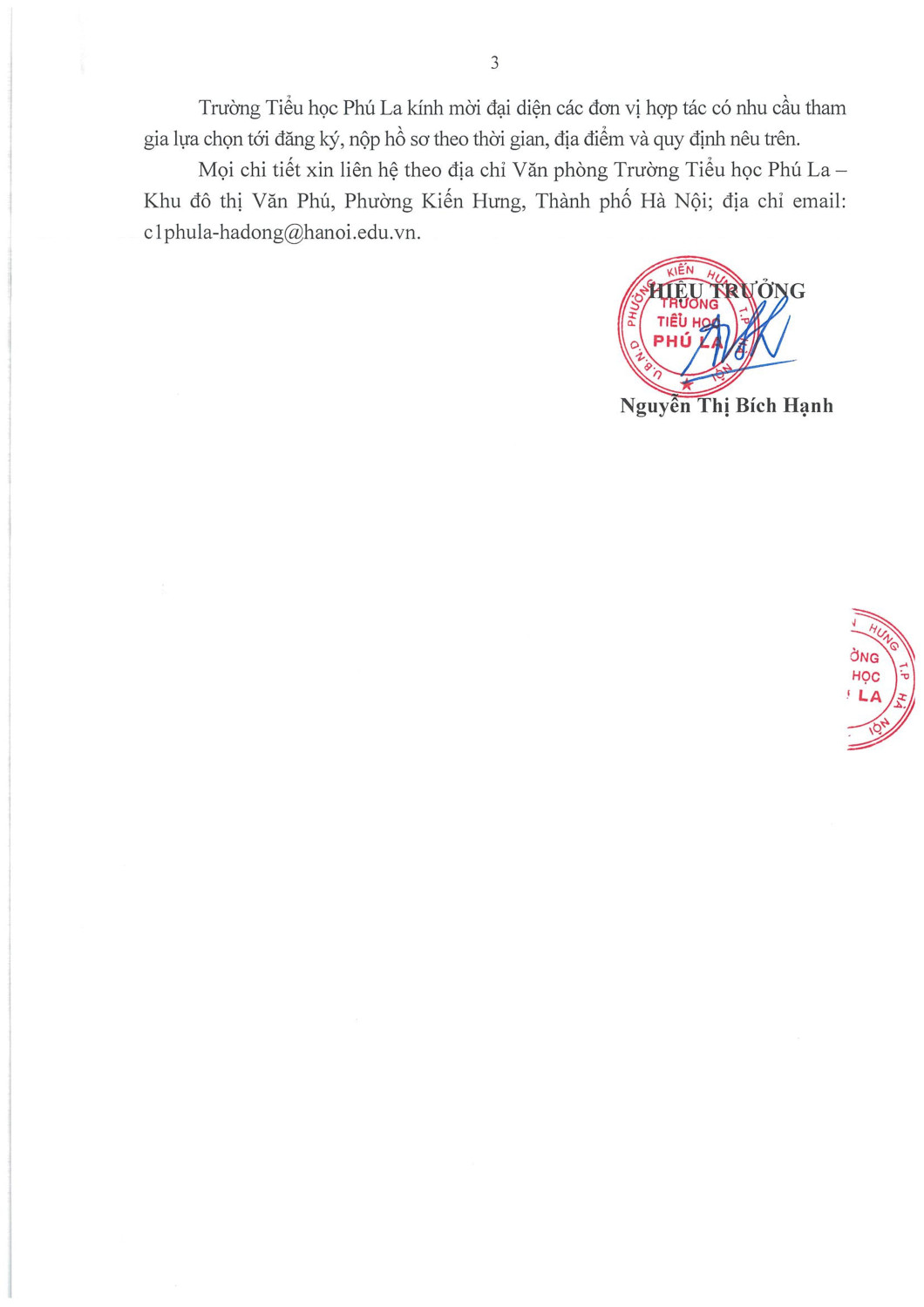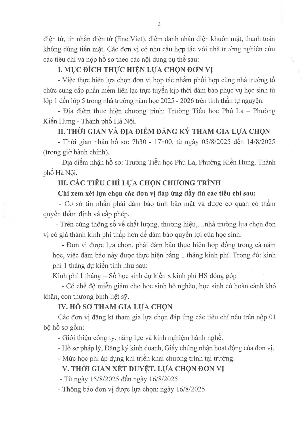 Đe chuẩn bị cho năm học mới 2025 - 2026. Trường Tiểu học Phú La tiến hành công khai tố chức lựa chọn đơn vị họp tác cung cấp phần mềm Thư viện điện tử, tin nhắn điện tử (EnetViet), điếm danh nhận diện khuôn mặt, thanh toán không dùng tiền mặt.
